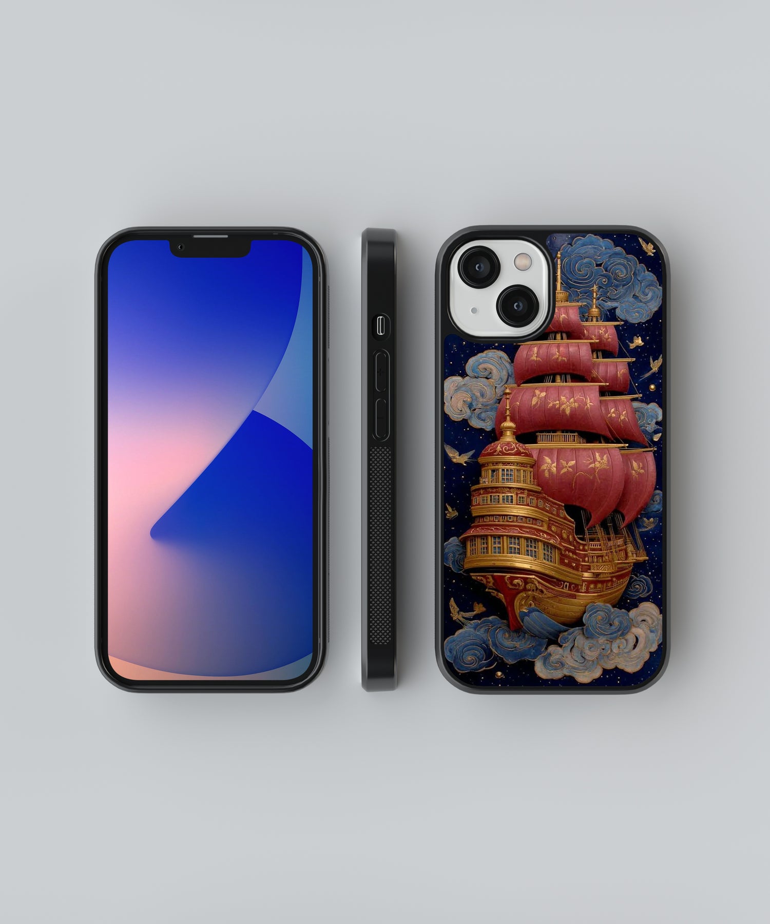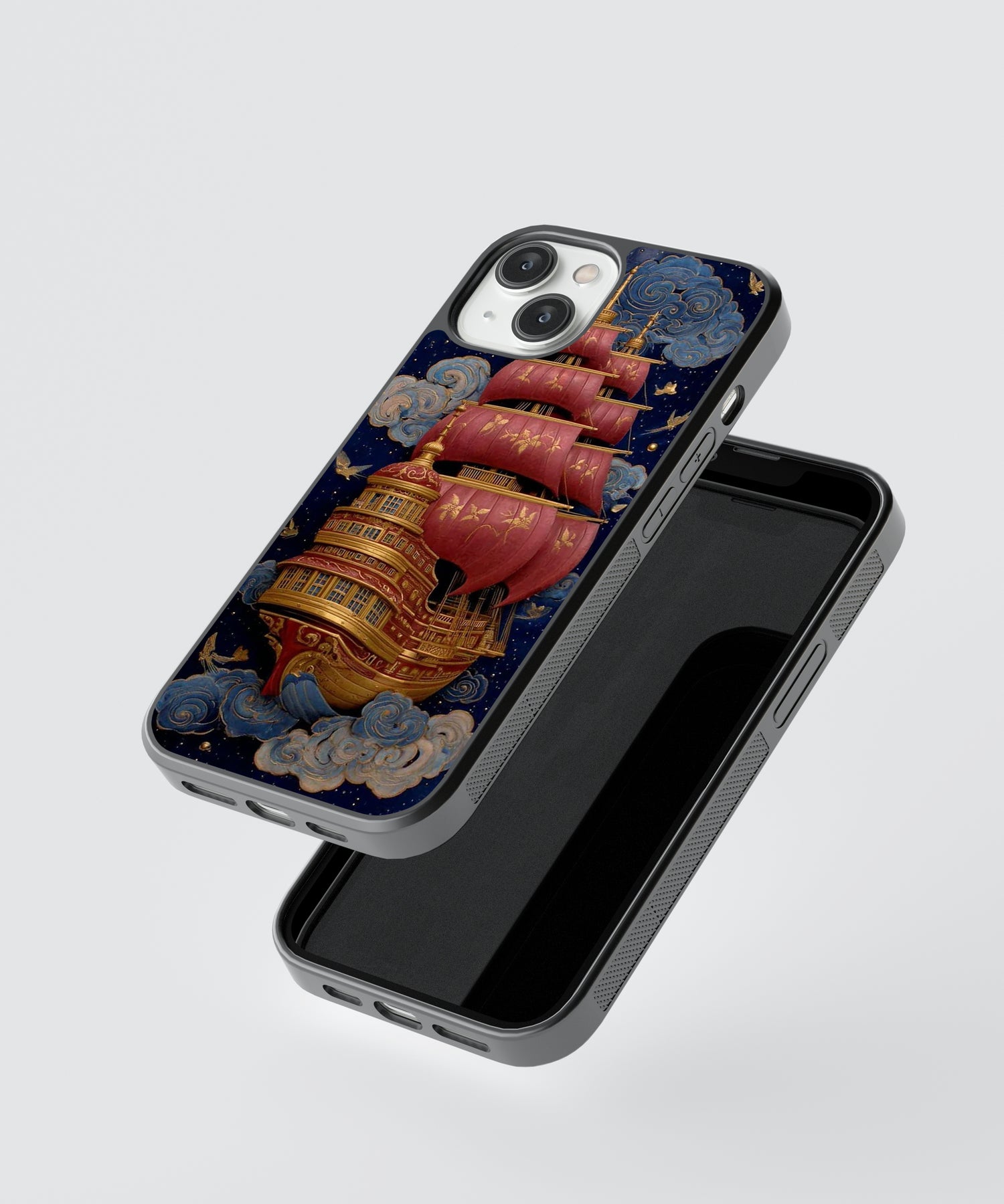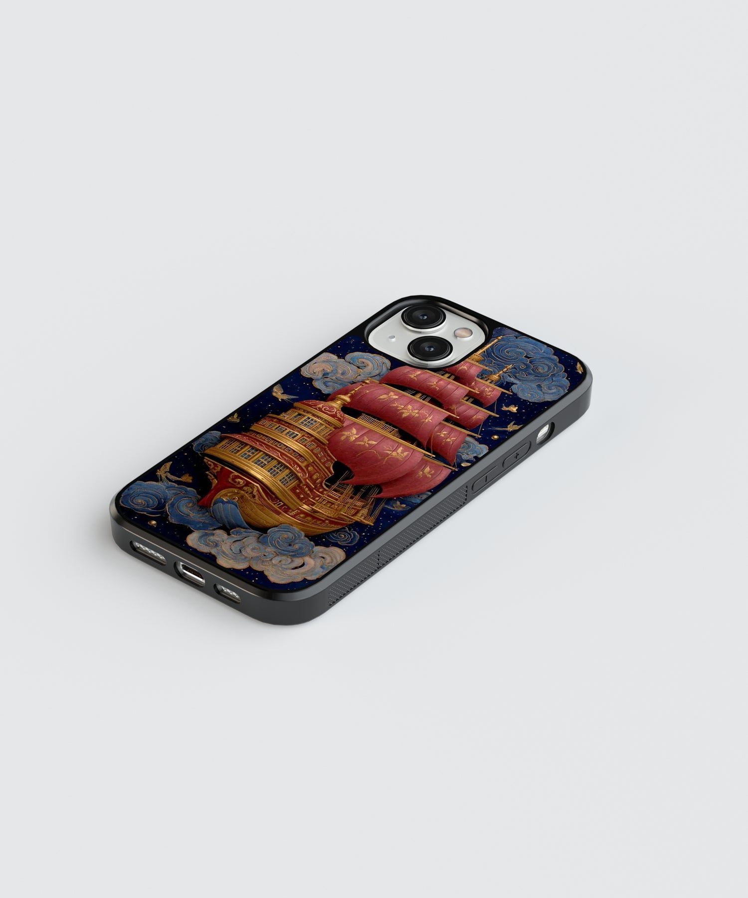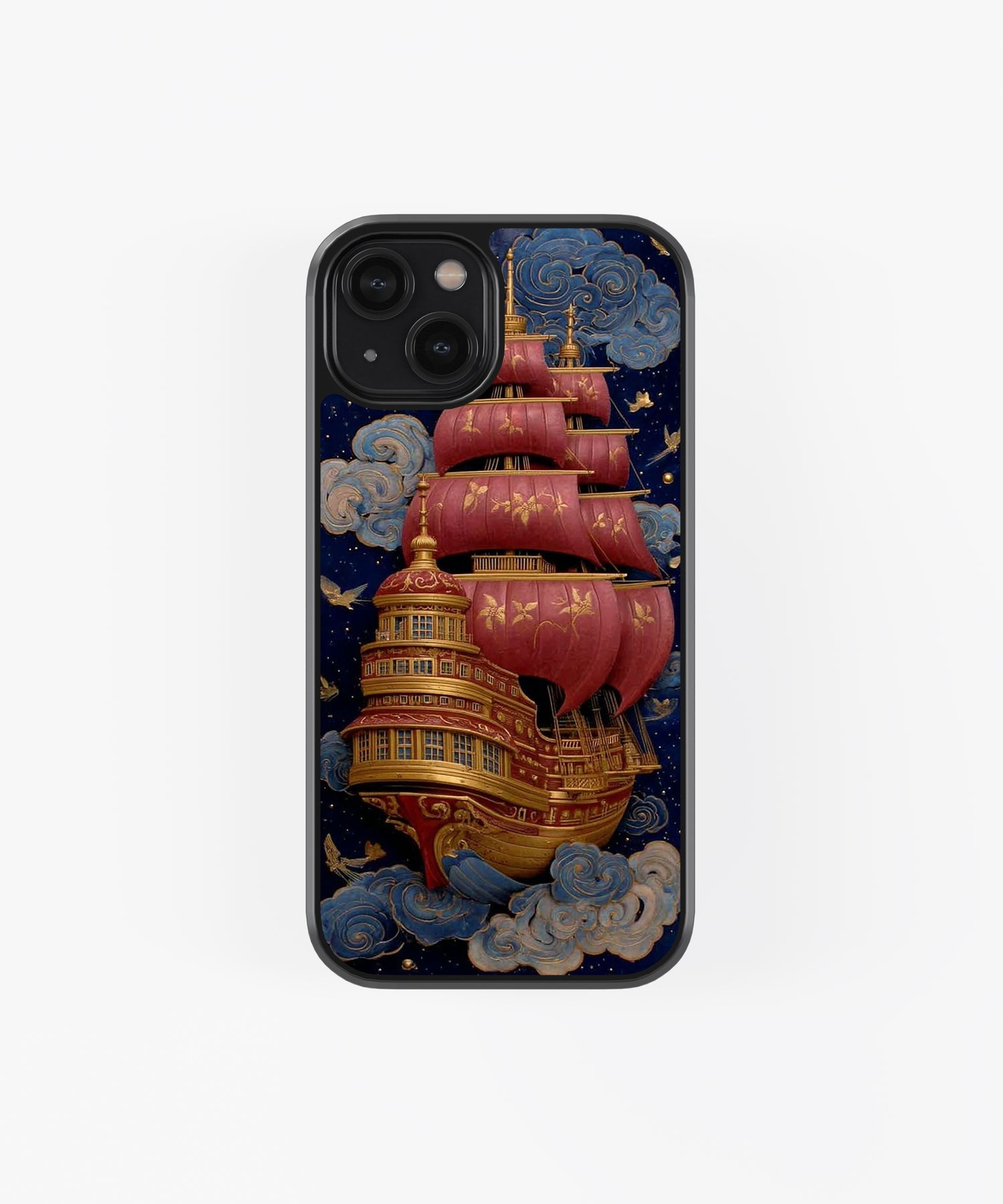 Sail beyond imagination with this stunning fantasy sky ship glass phone case 🚢☁️✨. Featuring a majestic vintage ship with rich red sails floating through dreamy clouds under a starry night sky, this design blends adventure, elegance, and fantasy storytelling.