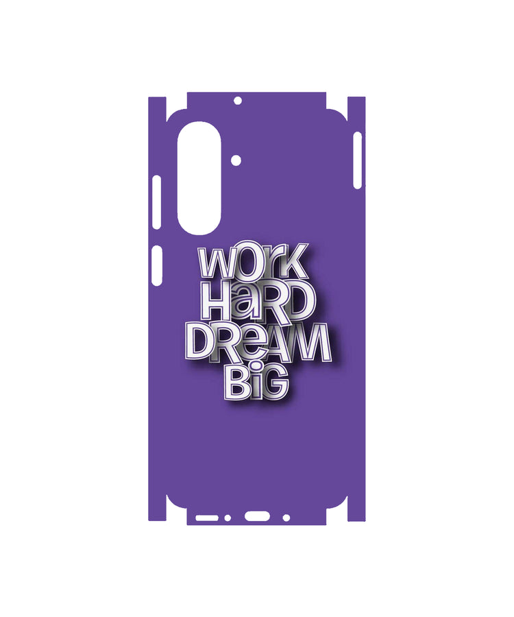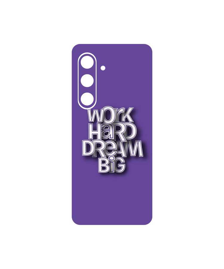The skin features a deep, calming Royal Purple base color, setting a tone of focus and creativity. Dominating the center is the crisp, dimensional mantra: "WORK HARD DREAM BIG", serving as a constant, powerful motivator every time you check your device.