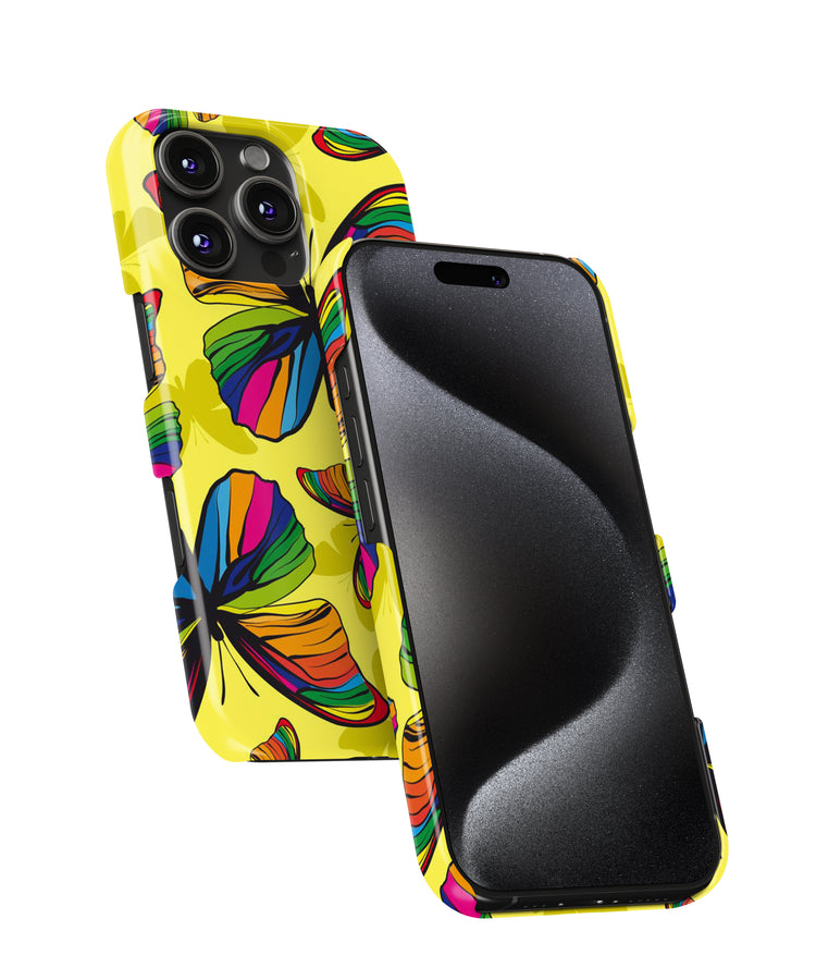 Unleash a burst of color with the Vibrant Monarch Snap Case. This eye-catching accessory features a dynamic pattern of large, stylized butterflies, each wing painted in a stunning rainbow of bright, bold colors (fuchsia, green, orange, blue, and yellow). Set against a vivid Lemon Yellow background, this case is designed to reflect a creative, energetic, and expressive personality. Crafted from durable polycarbonate, the slim snap-on design provides lightweight protection and a high-gloss finish that ensures the striking artwork remains brilliant and sharp.