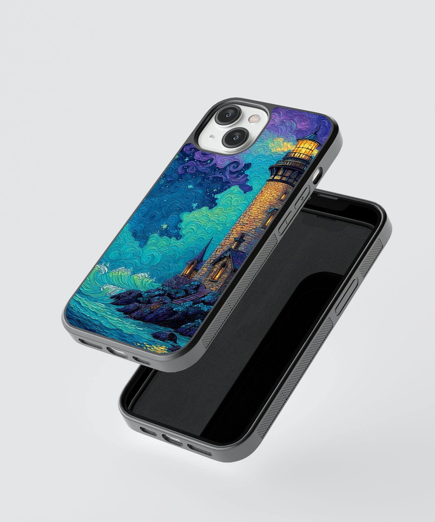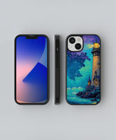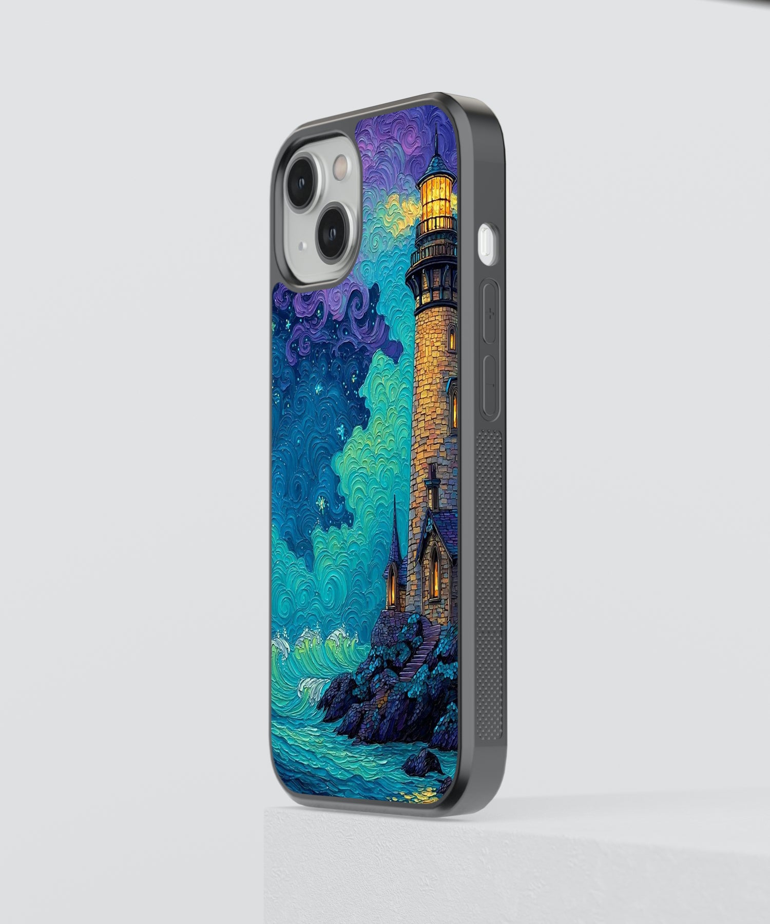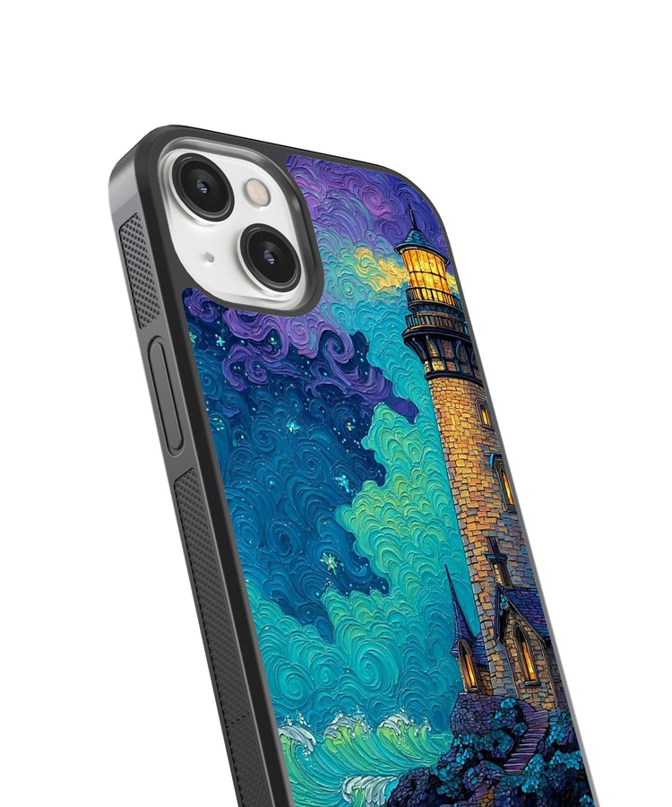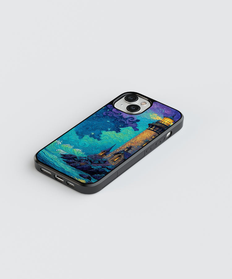 Luminous Ocean Lighthouse Glass Phone Case – Artistic Coastal Night Sky Protection