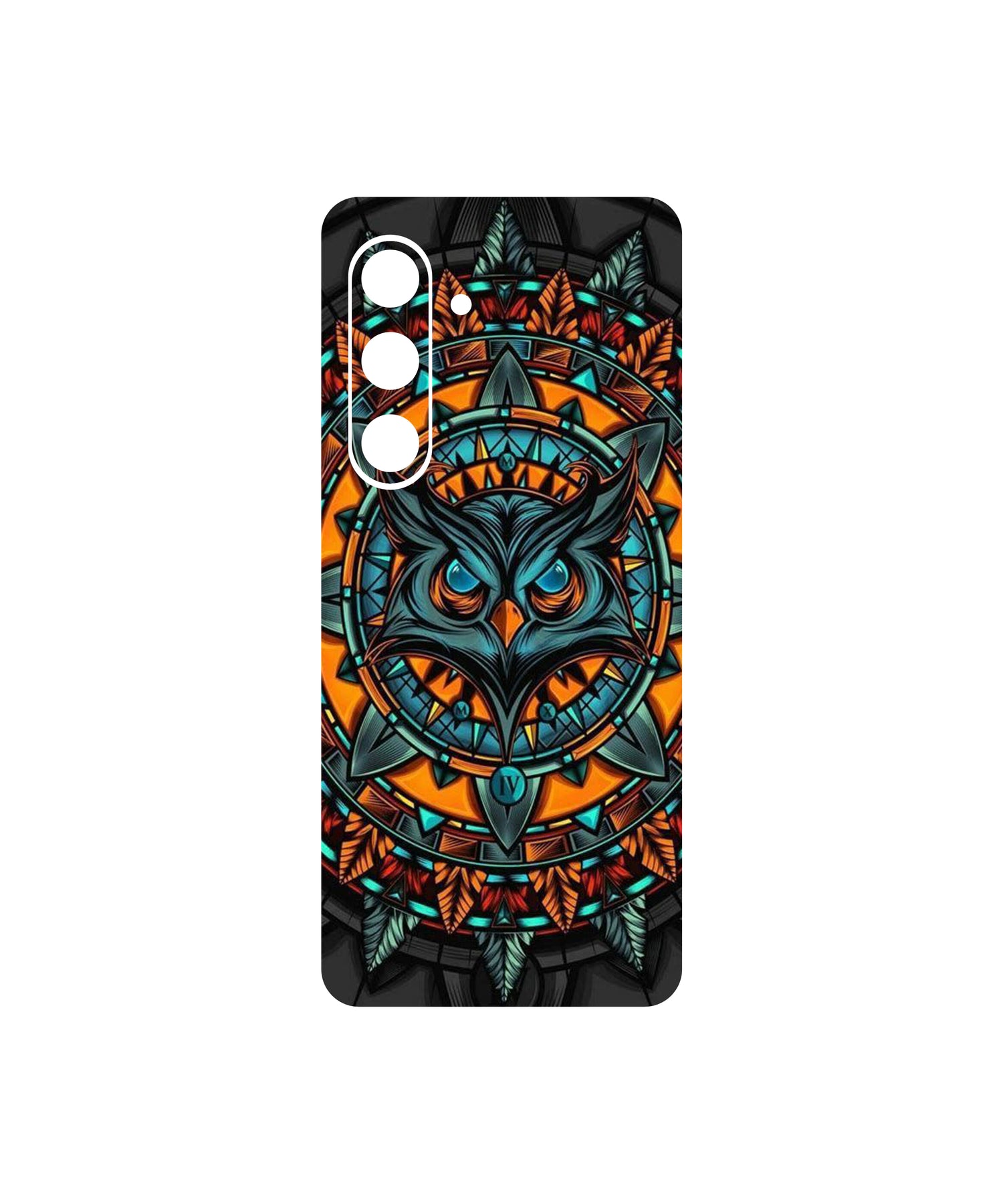 Unleash the spirit of wisdom and guardianship with this striking mobile skin! Featuring a fierce, stylized Owl with piercing blue eyes set against a highly detailed, circular Mandala design. The artwork is a vibrant mix of bright Neon Orange, contrasting Teal/Aqua Blue, and deep black, giving it a powerful, neo-tribal aesthetic.